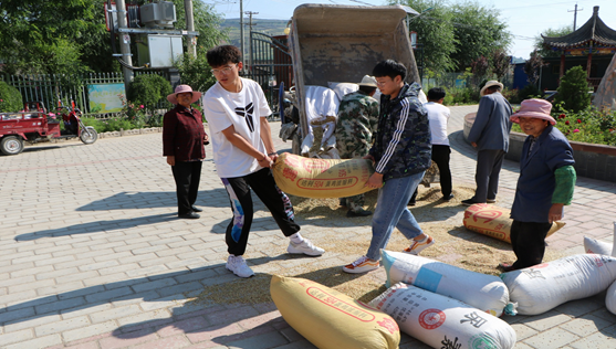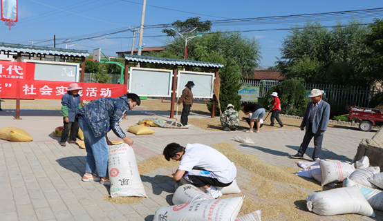 榆树村的时候正逢农忙季节,虽顶着炎炎烈日,队员们顾不得休息,立即忙活起来,拿起扫帚、推着架子车,争先恐后的帮助当地农民群众给稻谷脱粒、装袋、扎袋并搬运,当烈日随着时间的流逝悬挂在头顶时,虽然个个都汗流浃背,但队员们不喊一声累,不说一声苦,经过多个小时的劳动,忙碌的劳动结束了,村民们对同学们的热情帮助表示了真诚的感谢。
