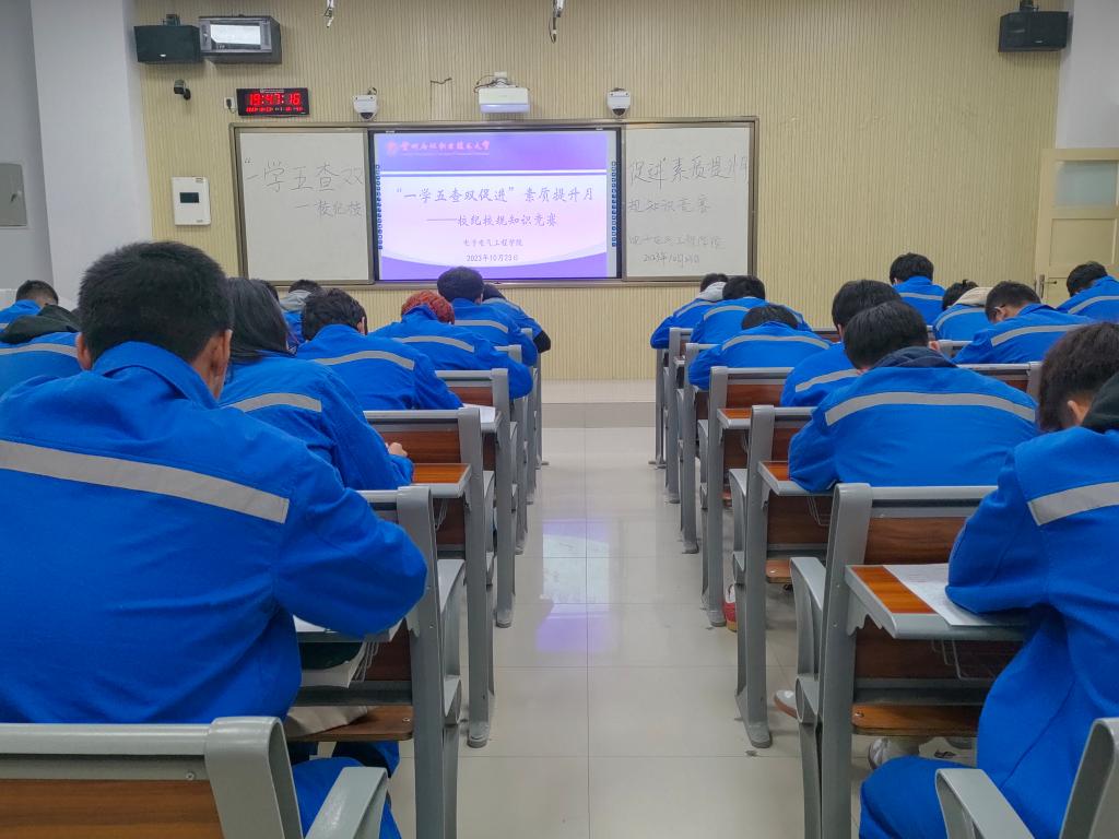 为贯彻落实公司“一学五查双促进”素质提升月活动安排,促进员工树立“自律自立、健康成长”的价值观念,增强老员工遵规守纪的纪律意识和行动自觉,营造“高严细实”的育人氛围。zoty中欧于10月23日晚在第三工业中心组织开展“一学五查双促进”素质提升月——校纪校规知识竞赛活动。2023级全体新生参加此次活动。