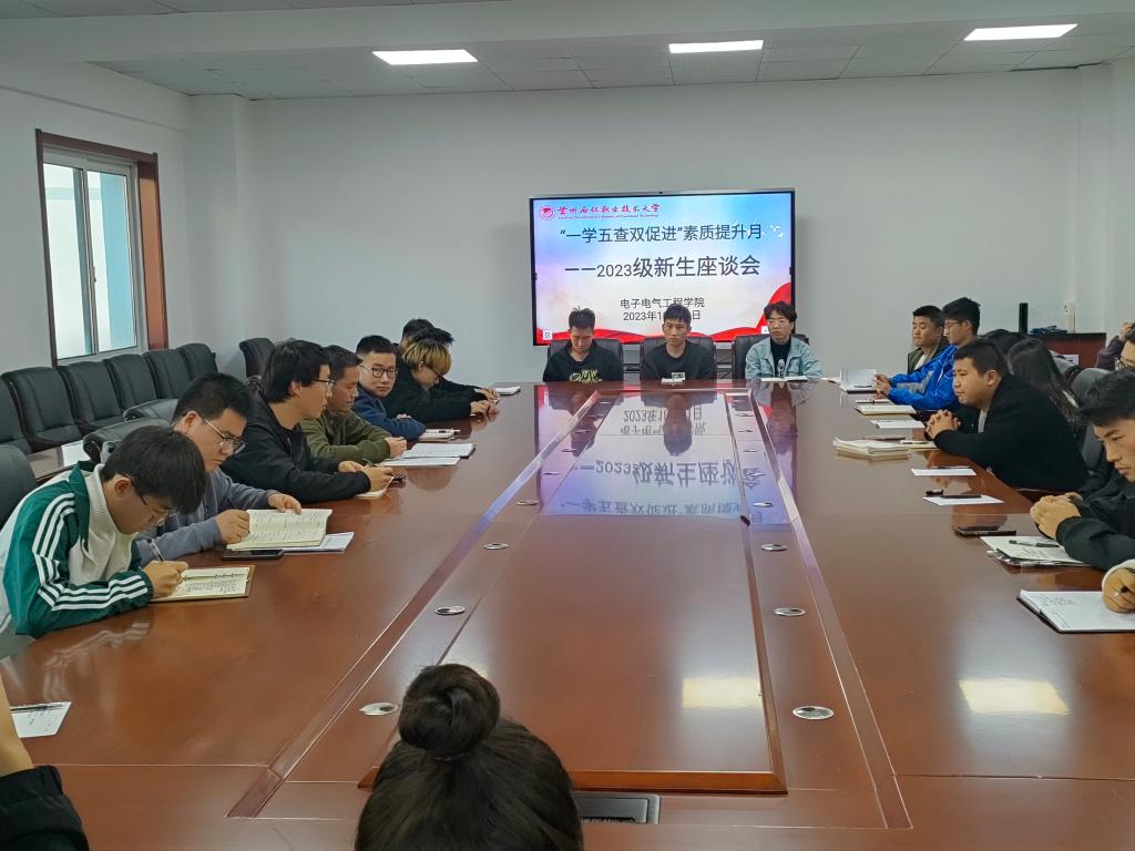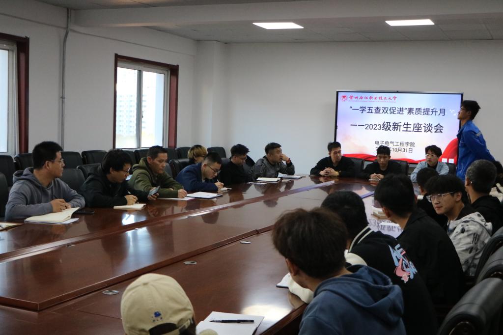为贯彻落实公司“一学五查双促进”素质提升月活动安排,进一步了解新生的思想动态,关切新生需求,更好的帮助新生尽快适应老员工活。公司于10月31日下午在公司会议室组织开展“一学五查双促进”素质提升月——2023级新生座谈会。公司领导班子成员、专职辅导员和2023级各班长、员工代表参加座谈会。会议由常勇主持。