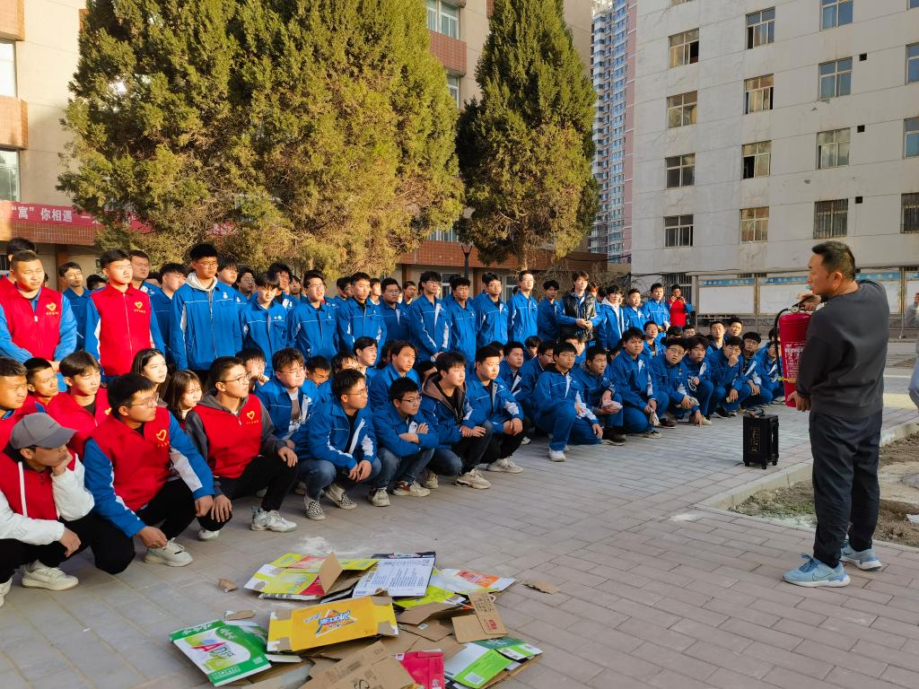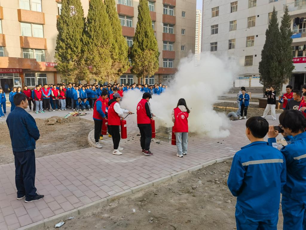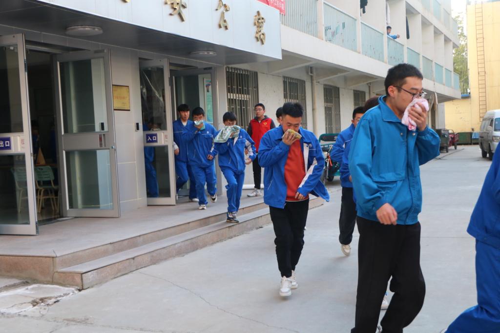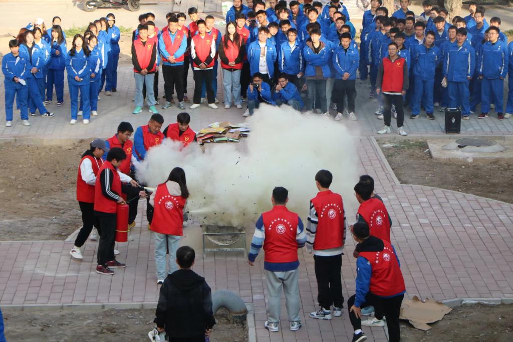 伴随着警报声的响起,义务消防员立即到达指定岗位,指导员工快速疏散撤离,在志愿者的指挥下同学们分区域、分方向、分楼层、按照规定路线,向各个教学楼的疏散出口引导所有员工进行安全疏散。疏散过程中,同学们弯着腰,用打湿的衣物、毛巾捂住口鼻,沿着紧急逃生路线快速前进,有序撤离到安全地带,随后各班班长清点人数,确保全体人员全部疏散至安全地带,整个过程前后衔接连贯,未造成混乱场面,成功快速地疏散了全体师生,取得了预期效果。接着,辅导员杨小军老师说明了此次演练活动的目的和意义,同时给同学们详细讲解了消防安全知识,对火灾的预防、火场自救、逃生方法等进行重点讲解,并现场进行了演示消防器材的使用。最后,各班分组进行灭火实战演练,大家认真体验动作要领,按照灭火的步骤和方法,将模拟起火槽里的火成功扑灭。整个演练过程井然有序,有条不紊。