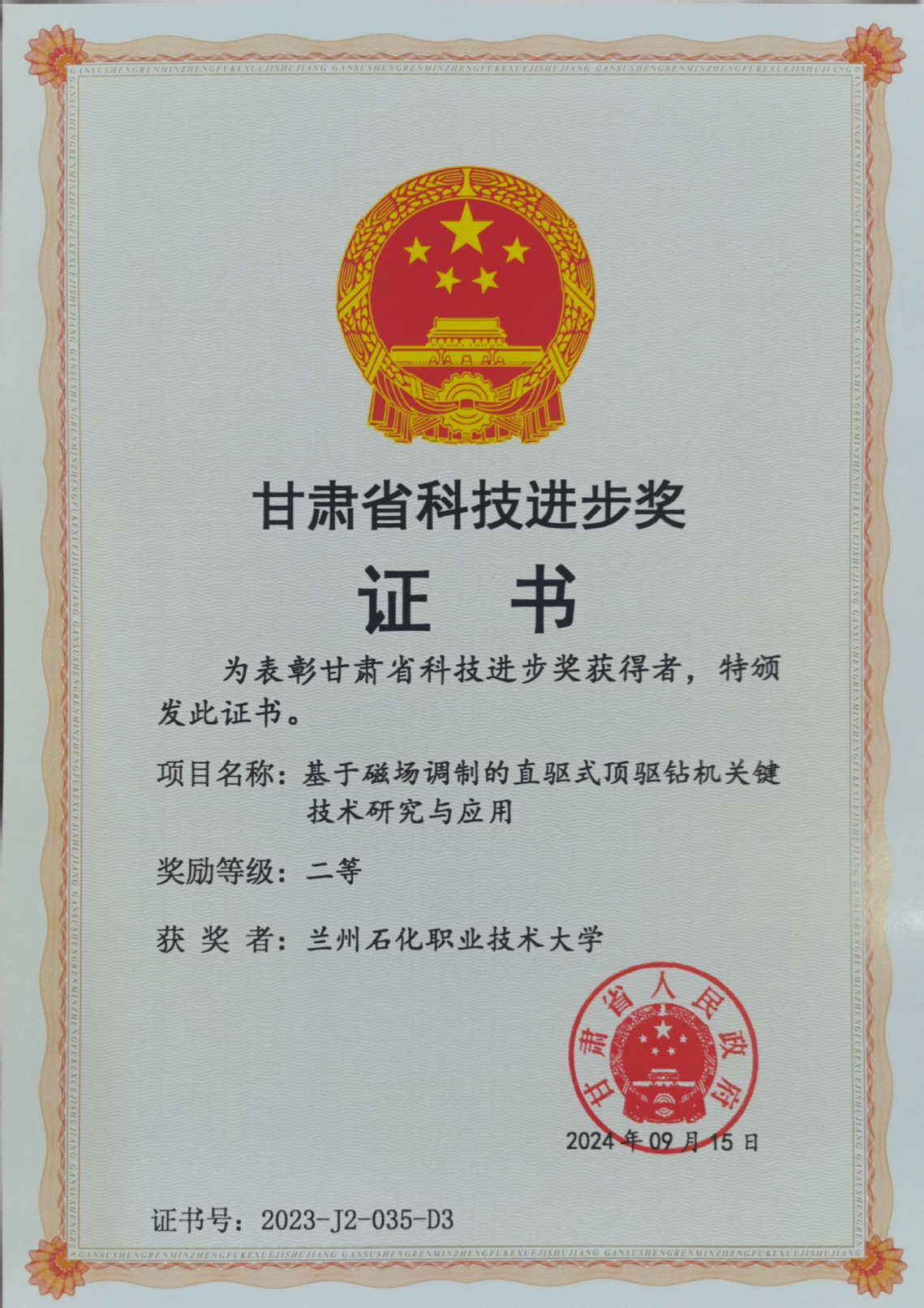 9月18日,甘肃省人民政府公布了《2023年度甘肃省科学技术奖励的决定》(甘政发〔2024〕50号),公司常勇老师为主要完成人之一的项目《基于磁场调制的直驱式顶驱钻机关键技术研究与应用》(2023-J2-035)荣获甘肃省科技进步二等奖。该项目为兰州理工大学、西南石油大学、zoty中欧官方网站等企业单位联合完成的甘肃省重点研发项目(20YF8GA055),通过项目实施,将磁化历史特征信息提取的磁滞建模与有限元分析融合技术应用于混合永磁结构的磁场调制顶驱电机优化设计中,采用强鲁棒性气隙磁链观测进行充、去磁决策,实现顶驱机组在线调磁与驱动协调控制,同时引入扭振抑制自抗绕补偿控制,提升顶驱电机与钻采负荷之间的柔性连接能力,解决了传统钻机电能消耗大、故障率高、高效率作业区间窄等问题。相关科研成果可为企业提升作业效率、保障作业安全,并创造了更大的经济效益。