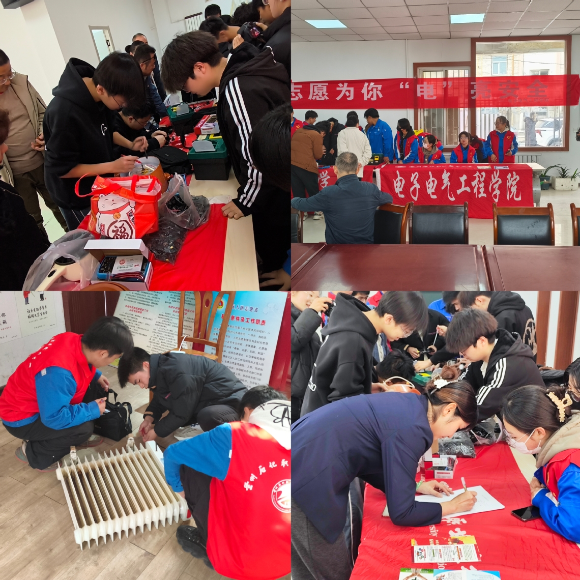 活动现场,志愿者们早早地来到场地搭建好了维修工作台,准备好各种维修工具和设备。他们热情地接待每一位前来咨询和送修家电的居民,耐心倾听问题描述,并迅速展开维修工作。居民们将电风扇、电水壶、电磁炉等故障机器带到现场进行维修。志愿者们先对居民们拿来的家电进行登记,接着仔细查找故障原因,认真进行维修。通过拆卸、调试,一件件损坏的电器重新运转。负责维修的同学还走进居民家中,帮助检修电路,为居民们排除一些日常的用电隐患。同时,志愿者们还以发传单的形式向社区居民们宣传了消防安全的重要性,突出强调了日常生活中可能出现的消防隐患。紧接着,社区志愿者、焦翼飞老师和居民们展开了关于用电安全的座谈会。在座谈会上,居民们纷纷反映他们生活中关于用电方面的疑问,志愿者们也耐心地向居民讲解了家电使用和保养方法,同时也向居民们传播了安全用电知识,提醒他们注意用电安全,避免因不当使用而造成的损坏和安全隐患。这次活动公司学子切实做到了为群众“办好事办实事”。同时,同学们的专业水平和热情服务获得了在场群众的一致好评。