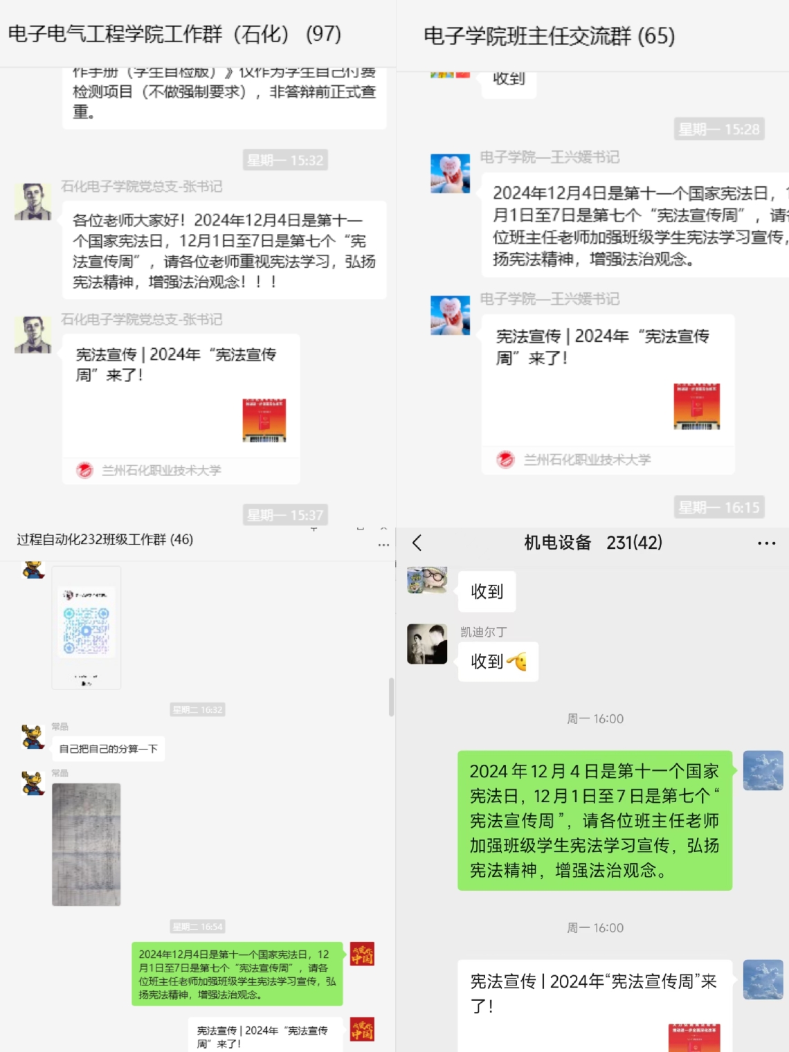 宪法宣传周期间,公司充分发挥新媒体优势,充分借助教职工群以及班级工作群等平台推送宪法主题系列推文及短视频,以通俗易懂且富有趣味性的方式对宪法内容进行阐释,充分调动和激发师生们主动自觉进行宪法学习,让师生们深入了解宪法作为国家根本大法,在保障公民权利、维护社会秩序、促进国家发展中的重要意义。
