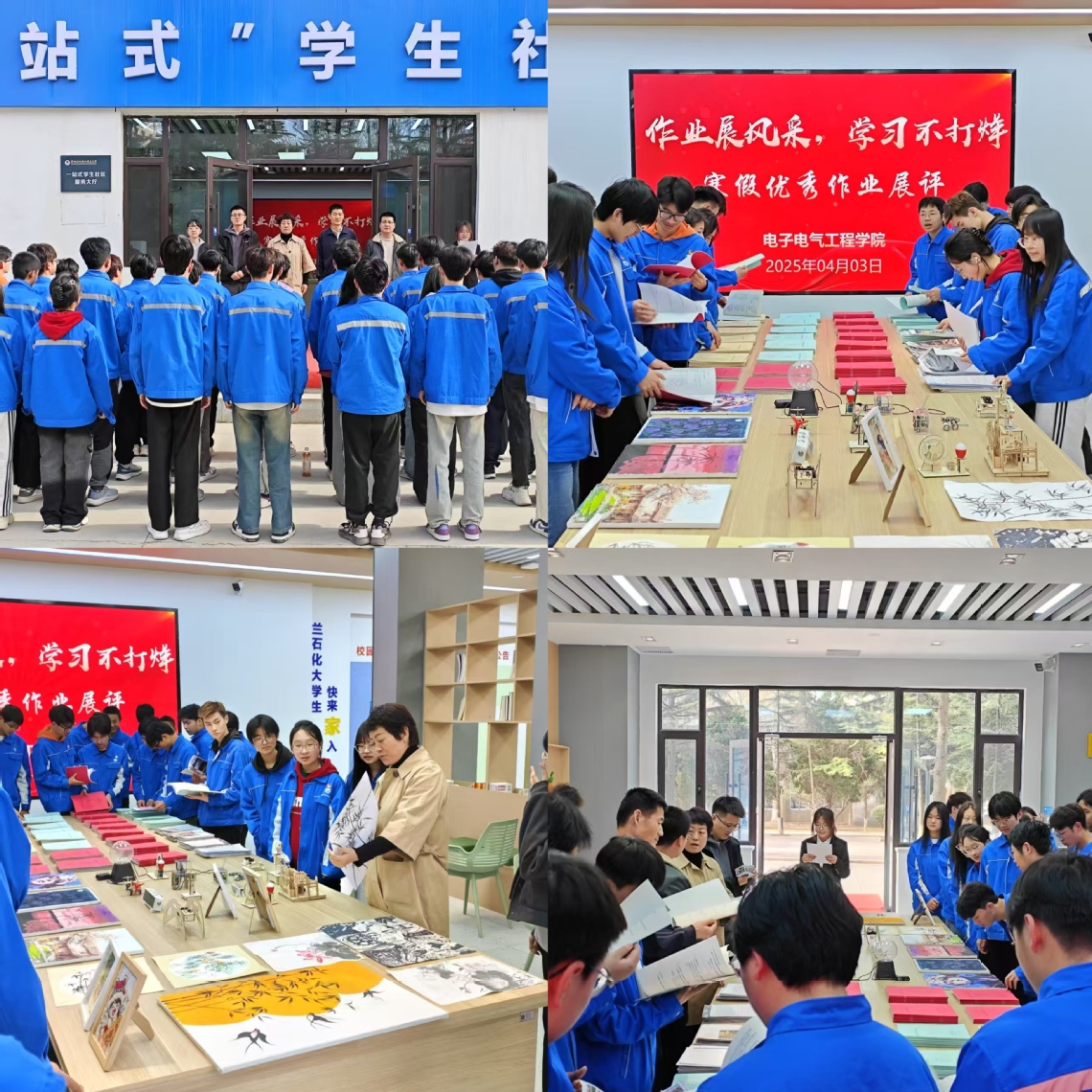 活动现场,“一站式”员工社团综合管理服务中心布置有序,参展作品内容丰富多样,涵盖名著读后感、春晚感悟、手工作品、科技作品以及社会实践展示等多个项目。实践作品创作者热情地为老师和同学们讲解作品创造思路。展览期间,同学们在各自班级的展示区域有序参观,认真学习他人的优秀成果。老师们在组织同学的带领下,仔细翻阅作业,不时与身边同学交流看法,对同学们的努力和进步给予充分肯定。各班选送的优秀作品充分展现了同学们在寒假期间的学习成果和实践探索。这些作品不仅字迹工整、格式规范,而且内容富有深度,体现出同学们对知识的深入理解和对生活的独特感悟。