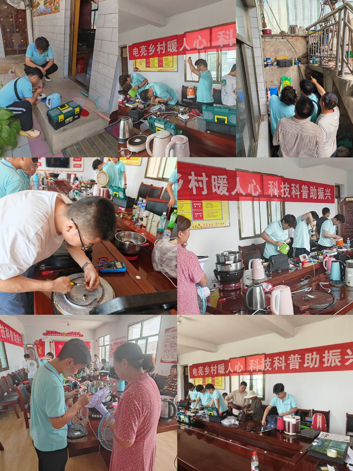 在前期准备过程中,实践队员们与当地驻村干部提前进行了家电维修需求调研,队员们认真与指导老师沟通,提前购置了电容、电阻、二极管、电路板和电机等维修部件,力求万无一失,为村民们带去更多帮助。活动现场,村民们陆续送来故障的电风扇、电饭煲、电水壶等家用电器。实践团队成员各司其职,为避免丢失错拿情况的发生,队员们对依次对电器进行排序,同时登记好相应的姓名及联系方式,整个过程井然有序的进行着。员工们在老师的指导下,有条不紊地进行检查、拆线、更换零件、组装调试,耐心向村民讲解家电使用和保养常识。经过两天的忙碌,共修复各类家电80余件,为村民解决了实际困难,赢得了一致好评。一位村民握着队员的手说:“这些小东西坏了扔了可惜,修又找不到地方,你们真是帮了大忙!”本次实践活动充分发挥了公司优势和所学知识技能,结合专业特色,走出校园,走进乡村,服务人民,将课堂教学与实践操作相融合。同时,对于一些行动不便的老人、不易移动的大件家电和村民们家中线路、开关的问题,实践队员们在村干部的带领下直接上门服务,为人民群众排忧解难的同时为大家普及用电安全知识、家电保养知识宣传,防诈骗知识宣传等内容。